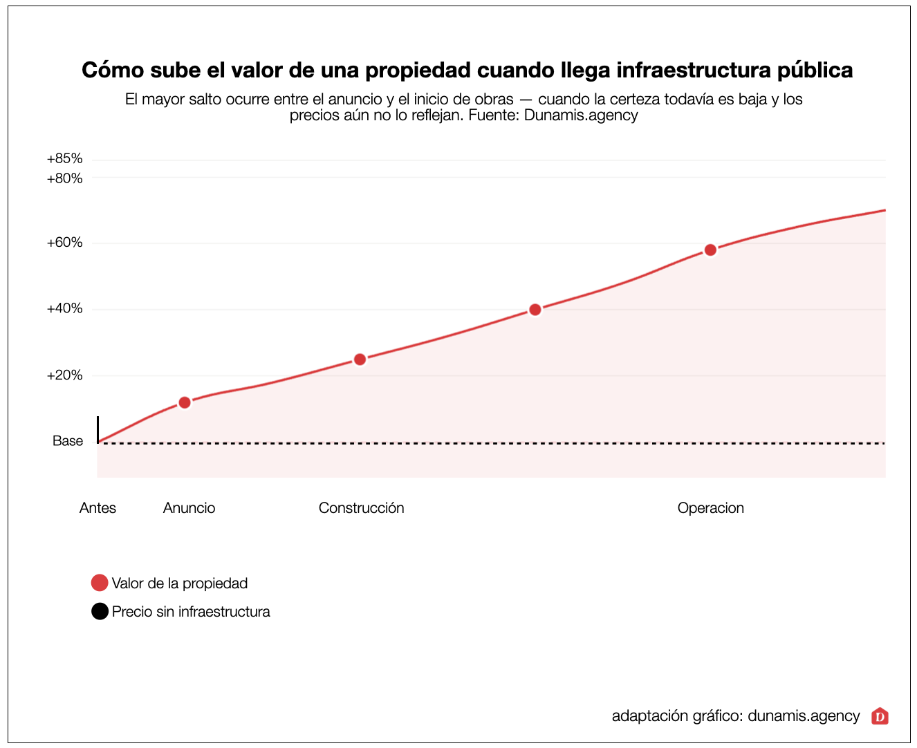Para el inversionista con horizonte de 3 a 5 años, la lógica es siempre la misma: entrar antes de que la infraestructura sea obvia para todos. La plusvalía más generosa está en el momento previo — cuando el precio de entrada todavía no descuenta lo que viene.