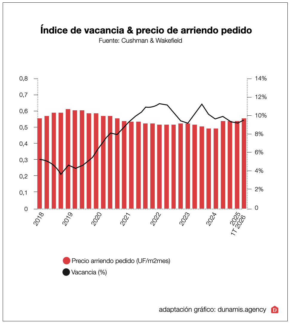 En oficinas, el mercado arrancó 2026 con una tasa promedio de 7,7% — primer registro de un solo dígito desde antes de la pandemia. El Golf en 6,4%, Nueva Las Condes en 5,5%. En el primer trimestre la vacancia subió levemente a 9,4% por ingreso de nueva oferta — Cushman & Wakefield aclara que sin ese efecto el mercado habría mostrado tendencia a la baja. Según La Tercera, hay 41.000 m2 proyectados para entrar este año y otros 100.000 m2 en propuesta — señal de que el mercado empieza a atraer desarrollo nuevo.