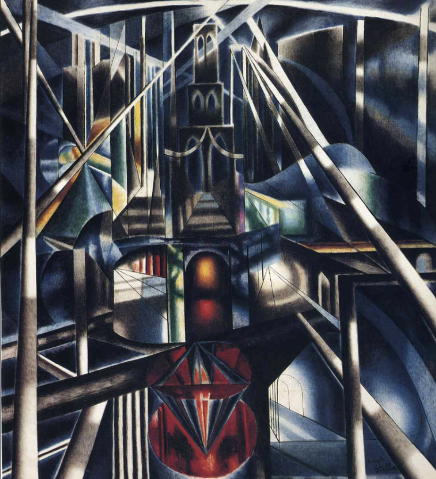 Lo que hizo después fue extraño y brillante. Tomó los puentes, las fábricas, los rascacielos de una ciudad que nadie había pintado todavía con ese nivel de delirio y energía, y los convirtió en catedrales. Sus cuadros de Brooklyn Bridge son liturgia industrial — geometría salvaje, luz artificial, velocidad congelada.